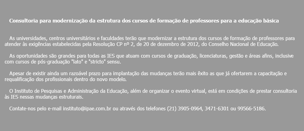 Consultoria para modernização da estrutura dos cursos de formação de professores para a educação básica As universidades, centros universitários e faculdades terão que modernizar a estrutura dos cursos de formação de professores para atender às exigências estabelecidas pela Resolução CP nº 2, de 20 de dezembro de 2012, do Conselho Nacional de Educação. As oportunidades são grandes para todas as IES que atuam com cursos de graduação, licenciaturas, gestão e áreas afins, inclusive com cursos de pós-graduação "lato" e "stricto" sensu. Apesar de existir ainda um razoável prazo para implantação das mudanças terão mais êxito as que já ofertarem a capacitação e requalificação dos profissionais dentro do novo modelo. O Instituto de Pesquisas e Administração da Educação, além de organizar o evento virtual, está em condições de prestar consultoria às IES nessas mudanças estruturais. Contate-nos pelo e-mail instituto@ipae.com.br ou através dos telefones (21) 3905-0964, 3471-6301 ou 99566-5186.